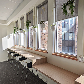 The centre’s new space was designed to support the work of its members. Its multipurpose rooms include a large meeting room (affectionately known as the “Collaboratory”), private hotelling desks for students, office space for visiting faculty members, a kitchenette and a row of high, window-side desks facing out onto the campus courtyard.